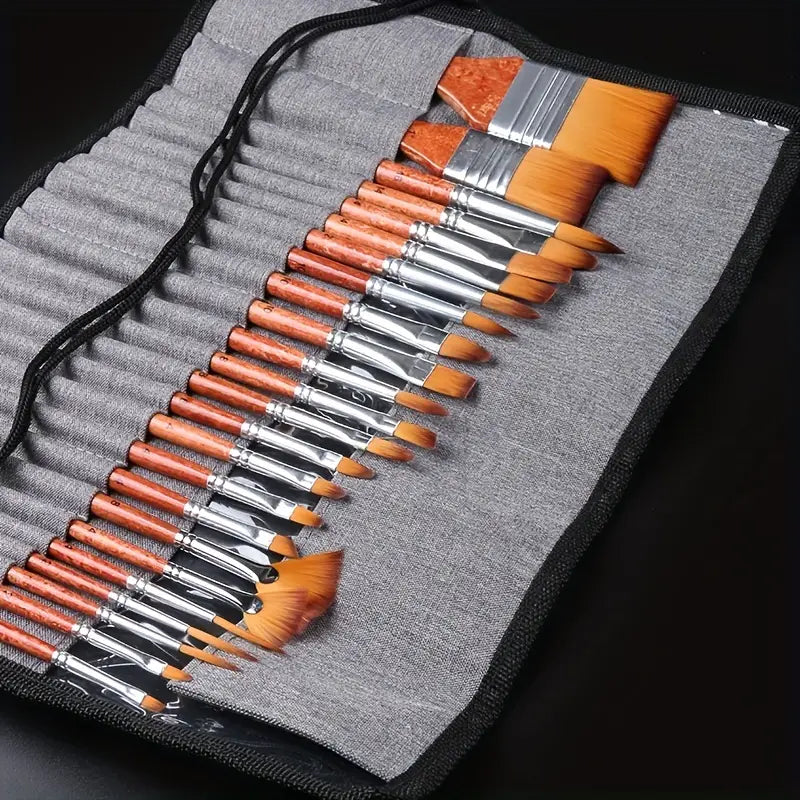 24 pcs/set Nylon Hair Handle Watercolor Paint Brush Artist Painting Brush for Acrylic Oil Watercolor Art Supplies Orange Wood Rod Portable Storage Pen Case