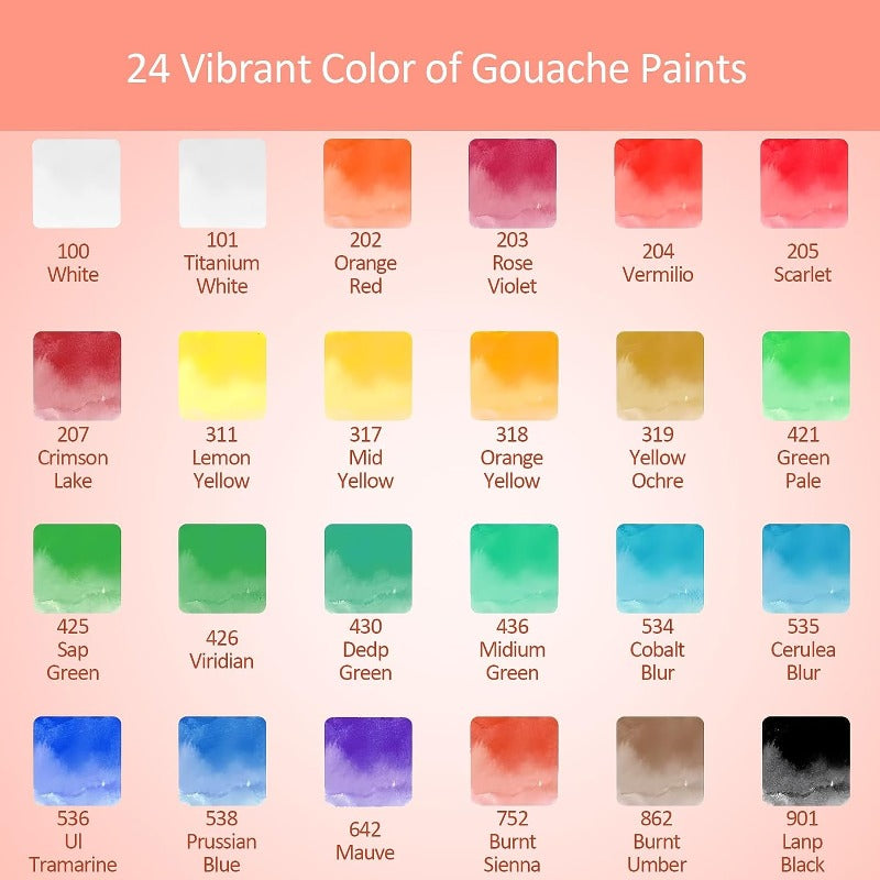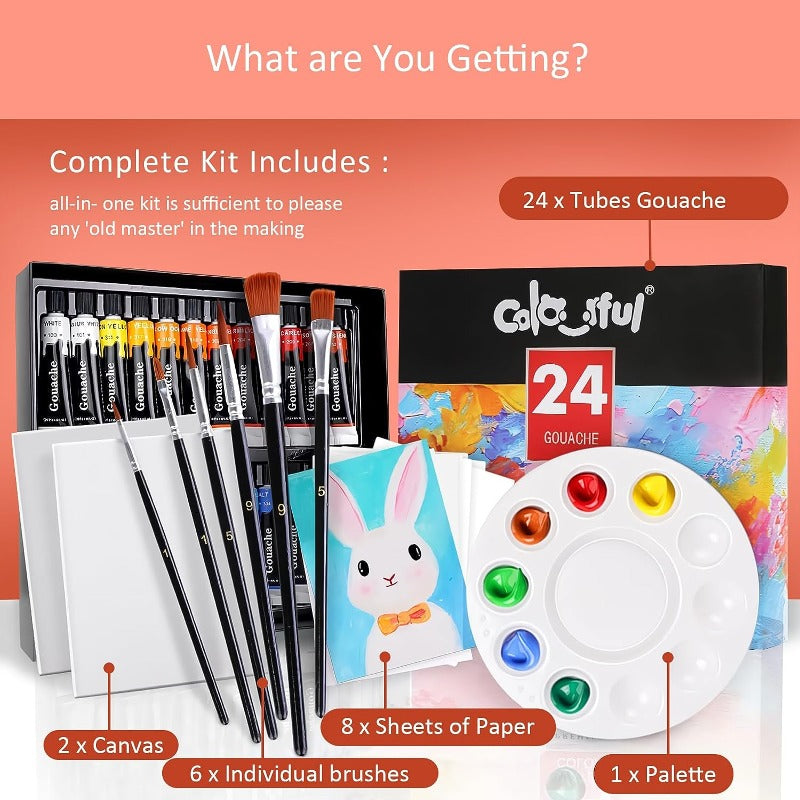 Create stunning art with this 12-color and 24-color non-toxic washable gouache paint set. The kit includes a variety of art supplies to make crafting easy and enjoyable, including brushes, palette, canvas and a paper pad. Perfect for art, crafts, home decor, and educational use.